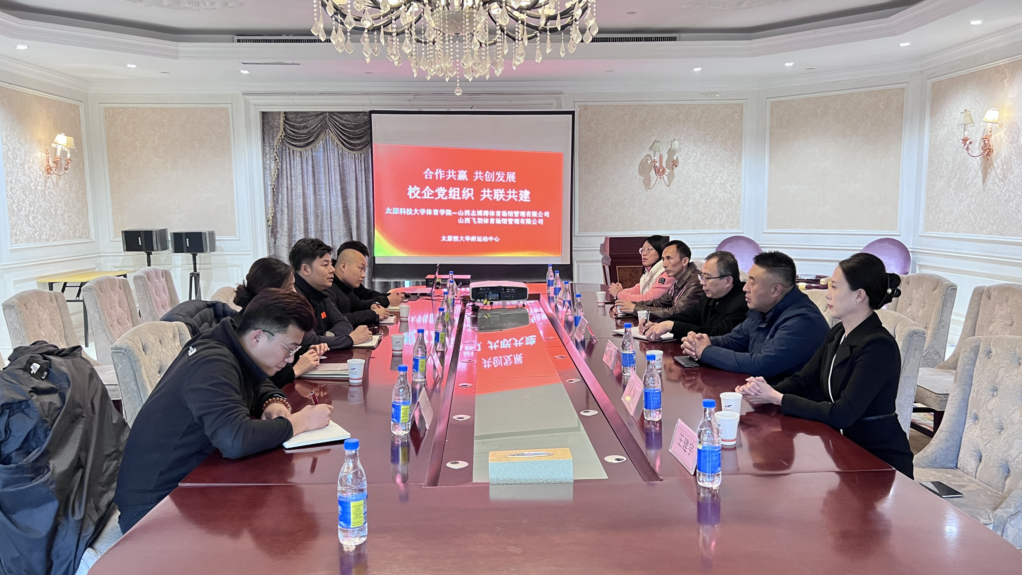 2025 年10月30日,在山西志博涛体育场馆管理有限公司会议室暖意融融,一场以“党建引领促融合,校企共建育英才” 为主题的共联共建交流活动在此举行。太阳成集团tyc41183党委书记杨海庆、院长王晓刚带领学院领导班子及骨干教师一行 6 人,与山西志博涛体育场馆管理有限公司、山西飞羽体育场馆管理有限公司党组织负责人王文哲、王颖、陈艳军等5位体育企业代表齐聚一堂,围绕体育场馆智慧化管理、复合型体育人才培养、行业需求精准对接等核心议题展开深度研讨,共同奏响校地体育产业协同发展的新篇章。