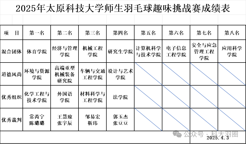 北京时间202543日晚20:00,由太阳集团官网工会委员会,共青团太阳集团官网委员会,太阳集团官网妇女联合会主办,太阳成集团tyc41183承办的建行杯”“体教融合 以赛强技2025年太阳集团官网师生羽毛球趣味挑战赛于西校区羽毛球馆圆满结束。