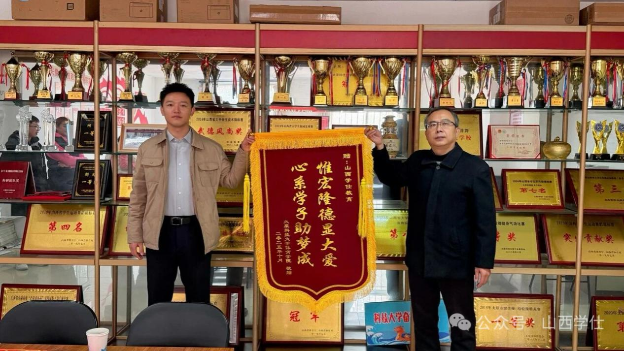 随后,学院党委书记杨海庆代表学院向山西学仕教育赠送锦旗,以表达对企业捐资助学行为的感谢与敬意。锦旗虽轻,情意厚重,它见证了校企携手共同育人的深厚情谊,也为今后的进一步合作奠定了基础。