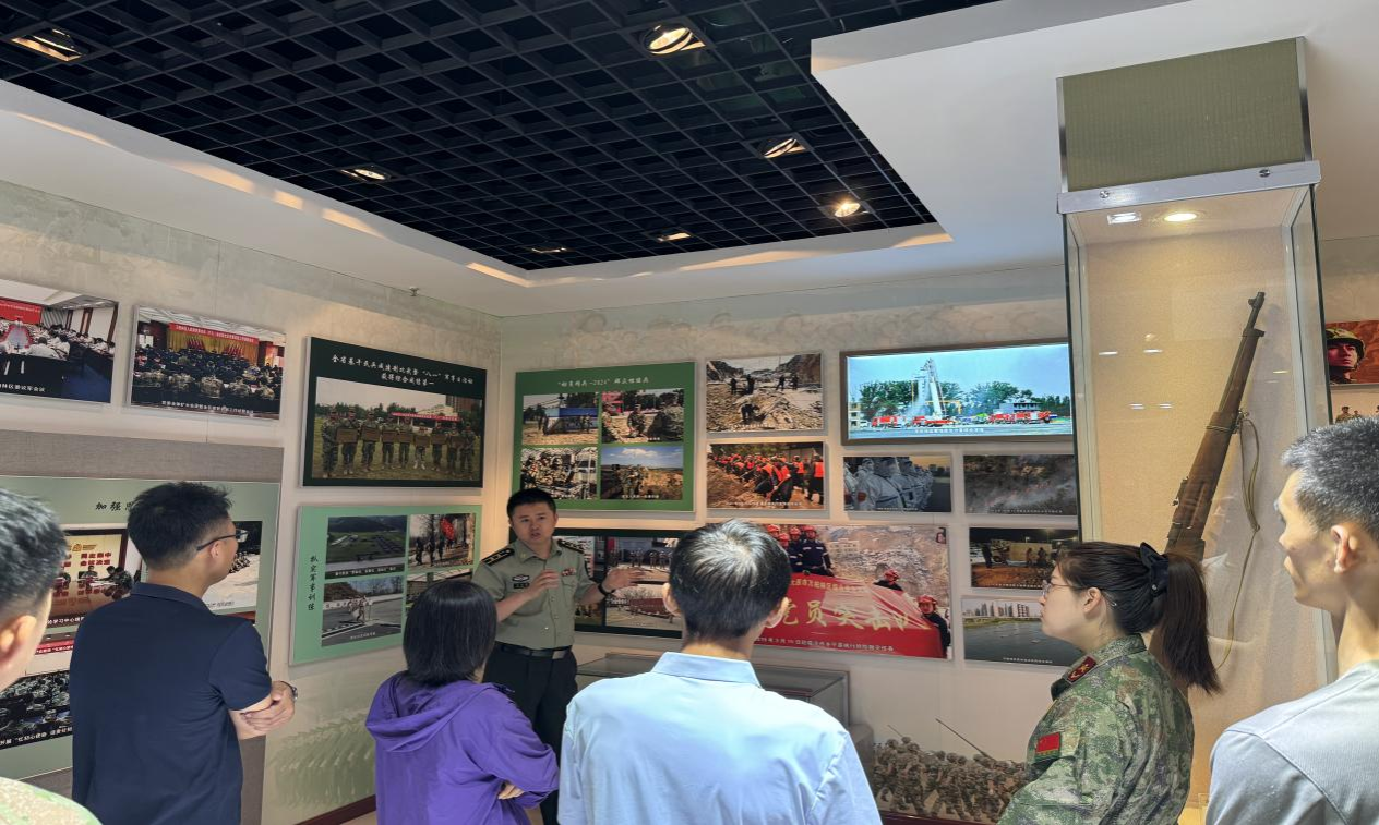 在万柏林区人武部的精心安排下,团队首先参观了国防教育史馆体能训练场所人武部官兵详细介绍了室内的陈列,通过巨大的电子屏幕展示了应急指挥的流程,包含天气预警、交通预警、森林火灾预警等。通过丰富的史料展陈和现代化装备展示,团队成员深刻感受到我国国防力量从筚路蓝缕到日益强大的辉煌历程,以及一代代革命先辈为民族独立与国家富强作出的巨大牺牲和卓越贡献。人民军队的光荣传统与新时代强军兴军的铿锵步伐,进一步激发了团队的爱国情怀和使命担当