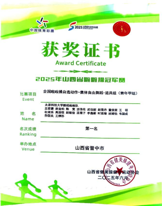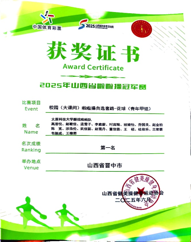 我校啦啦操代表队在王燕、赵艳洁、范艳芝、牛娜娜四位教练的悉心指导下,参与了“校园大课间啦啦操自选套路 - 花球(青年甲组)”和“全国啦啦操自选动作——集体自由舞蹈(道具组)青年甲组”的比赛。比赛中,我校啦啦操代表队凭借精湛的技艺、整齐划一的动作和饱满的热情,以出色的表现和精彩的演绎脱颖而出,一举斩获两项冠军。