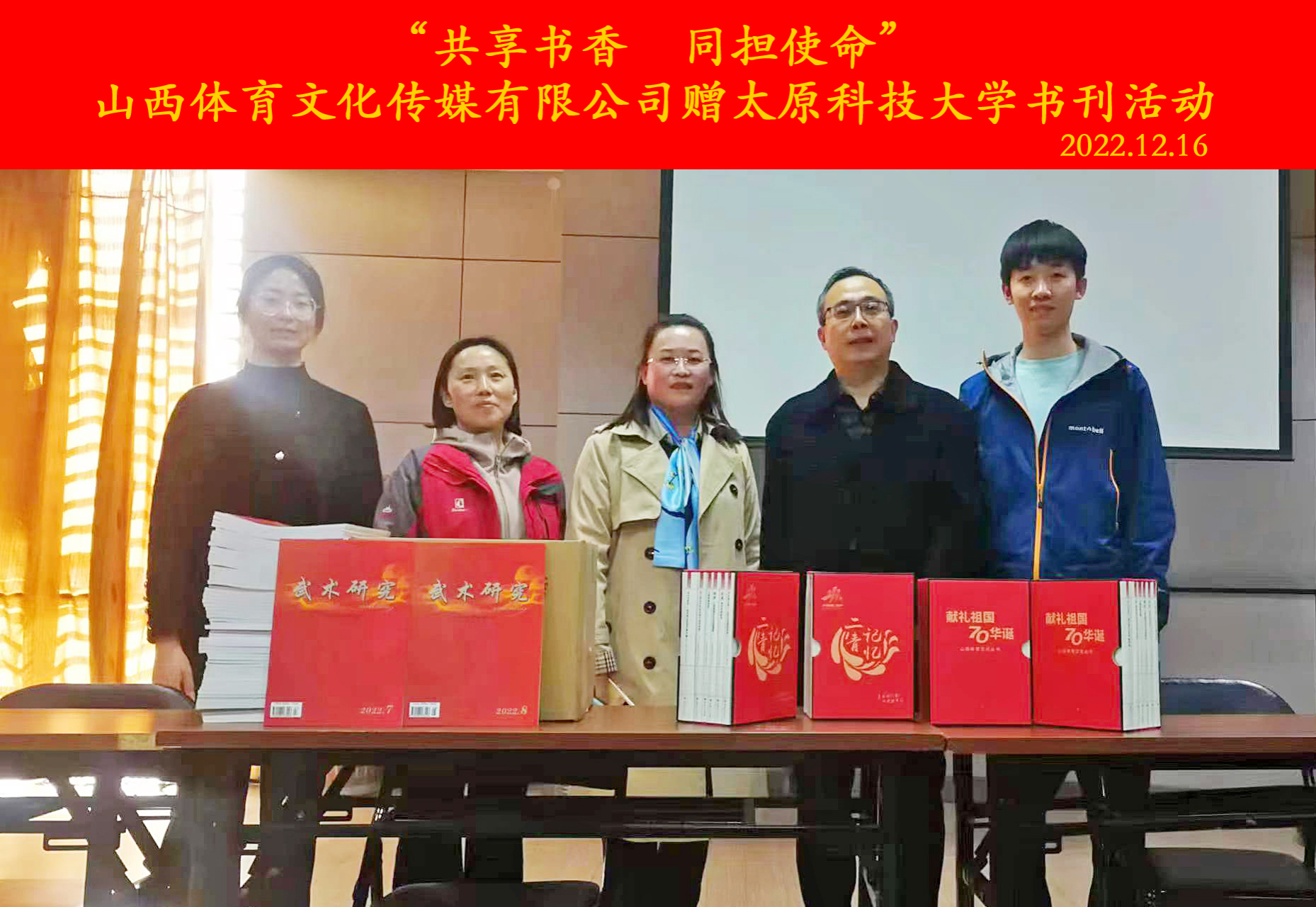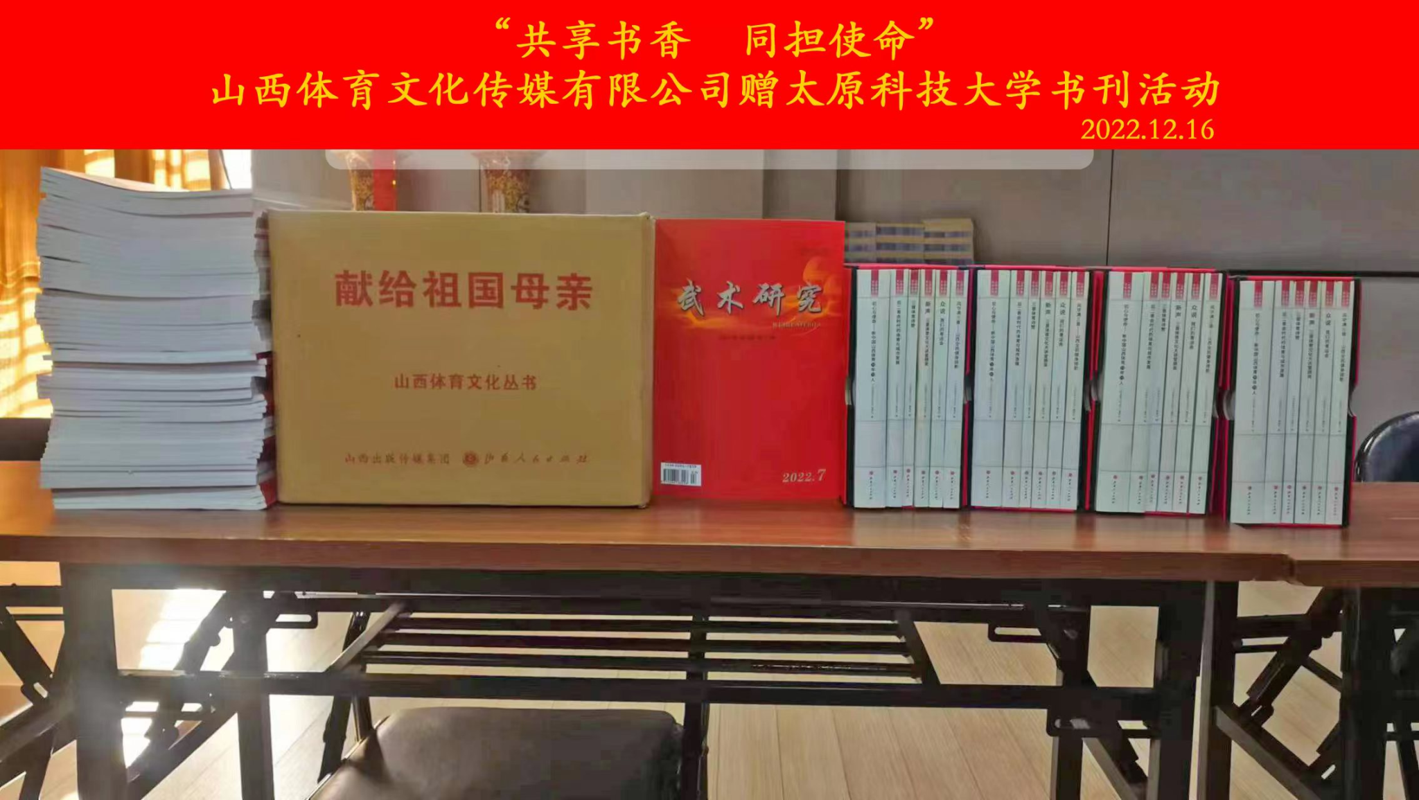 此次山西体育文化传媒有限公司共捐赠图书150余册,捐赠的图书包括两套《献给祖国母亲七十华诞 山西体育文化丛书》共50册及最新《武术研究》期刊100余册。