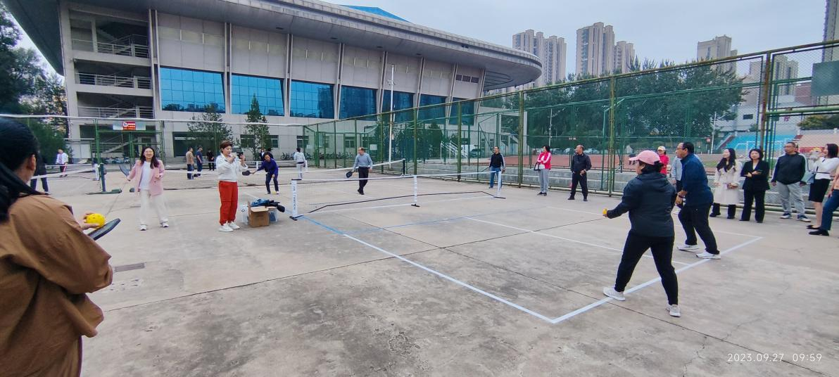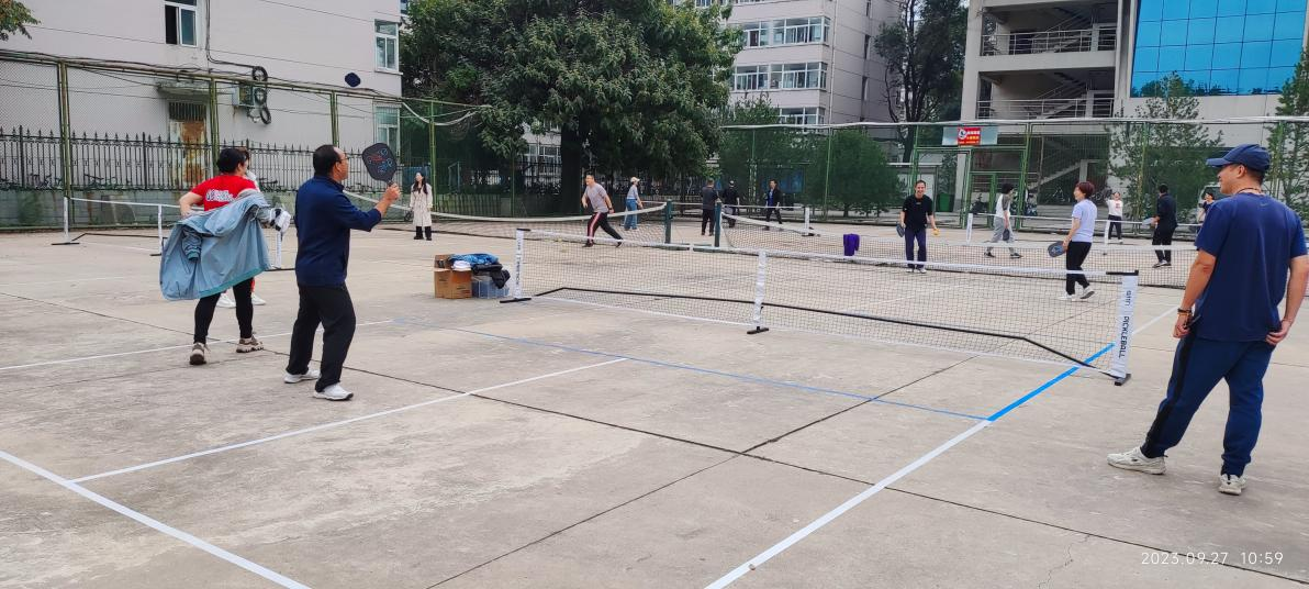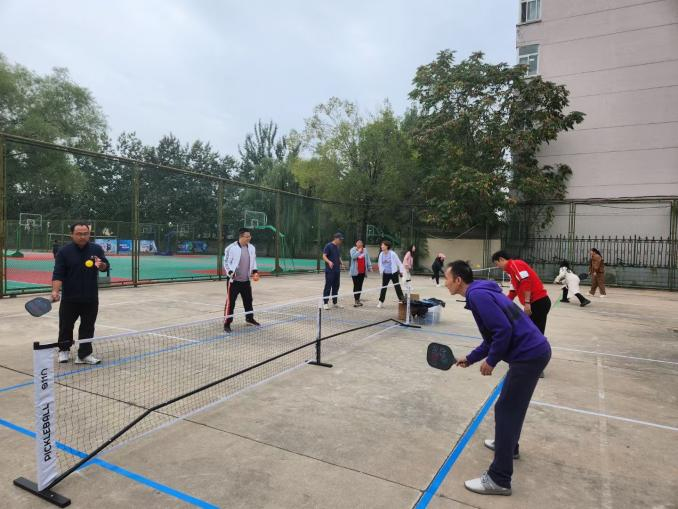 匹克球是集网球、羽毛球、乒乓球、壁球运动于一体,是近年来在世界上高速发展的全民健身运动,它最突出的特点是简单有趣、极易上手、运动量适中,能同时享受网球、羽毛球、乒乓球、壁球的运动乐趣,却极少运动损伤,可谓老少咸宜。体验过的老师们都开玩笑的说:感觉自己像是拿着乒乓球拍子,在羽毛球场地上打网球。