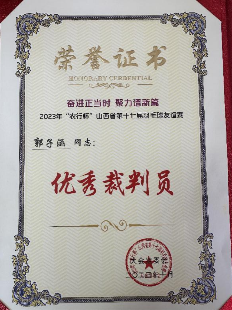 太原科技大学太阳成集团tyc411832020届学生郭子涵在2023年“农行杯”山西省第十七届羽毛球友谊赛中荣获优秀裁判的荣誉。