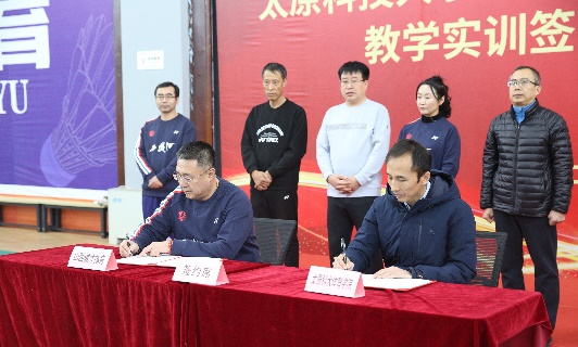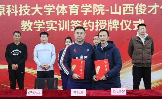 为了进一步提升我校体育专业学生培养质量,提升学生的专业技能水平,2023年11月23日,我院与山西俊才体育文化传播有限公司举行教学实训基地签约授牌仪式。学院党委书记杨海庆,副院长王兴一,山西俊才体育文化传播有限公司董事长李俊,总经理王金纯,山西省羽毛球协会副主席兼秘书长梁永威出席了仪式并见证了签约。