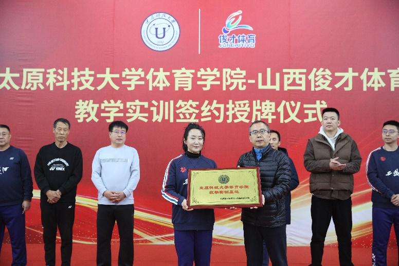 学院党委书记杨海庆先生为山西俊才体育文化传播有限公司授牌,山西俊才体育文化传播有限公司董事长李俊女士接牌。
